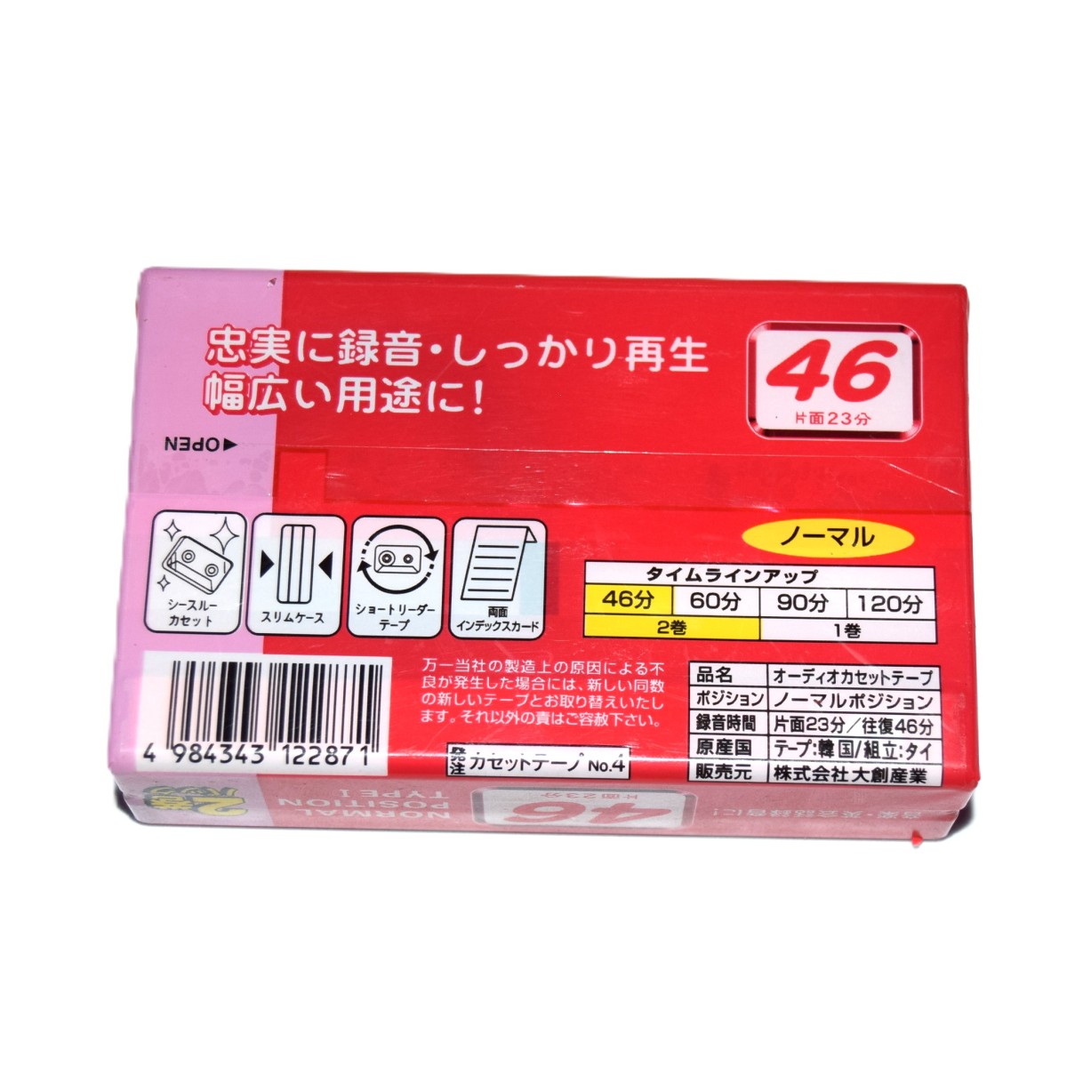 Pack de 2 Cintas de caseette vírgen de la marca Daiso. Posición Normal. Fabricada en Korea.